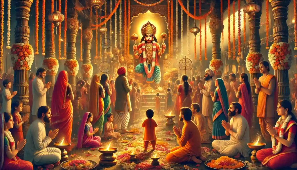 • Devotees offer sindoor, laddoos, flowers, and garlands to the deity.